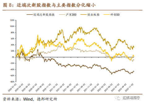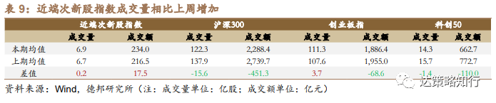 从日成交量和成交额数据来看,本周近端次新股指数均值分别为6.9亿股、234.0亿元,成交量较上周有所增加;沪深300指数成交量有所减少。