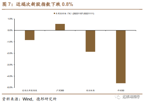 近端次新股指数下跌0.8%。(1)本周近端次新股指数(-0.8%),沪深300指数(0.6%)、创业板指(-1.9%)、科创50(-4.6%)。(2)本周近端次新股指数交易热度上升。截至2022年11月11日,5日次新股换手率均值为12.0%,较上周增加0.8pct,处于2021年1月1日以来66%分位水平。(3)从日成交量和成交额数据来看,本周近端次新股指数均值分别为6.9亿股、234.0亿元,成交量较上周有所增加;沪深300指数成交量有所减少。