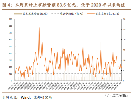 本周融资规模较上周上升。沪深板块上市7家,累计IPO融资规模83.5亿元,平均融资规模11.93亿元,低于2020年初以来周融资规模均值。
