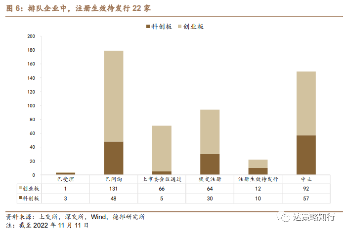注册生效待发行22家。截至2022年11月11日,注册制新股处于已受理至注册生效状态370家,其中已受理4家,已问询179家,上市委会议通过71家,提交注册94家,注册生效待发行22家,此外有149家处于中止审查状态。