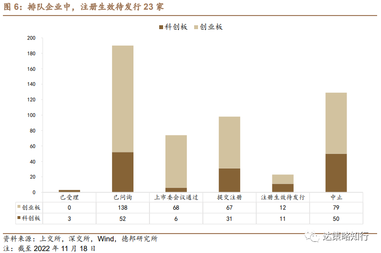 下周2只新股将参与初步询价。(1)初步询价时间安排:11月22日,尚太科技(001301.SZ);11月24日,长盈通(688143.SH)。(2)注册生效待发行23家。截至2022年11月18日,注册制新股处于已受理至注册生效状态388家,其中已受理3家,已问询190家,上市委会议通过74家,提交注册98家,注册生效待发行23家,此外有129家处于中止审查状态。