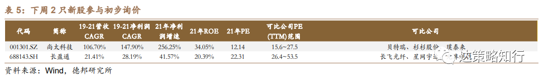 下周已公布2家参与初步询价。初步询价时间安排:11月22日,尚太科技(001301.SZ);11月24日,长盈通(688143.SH)。