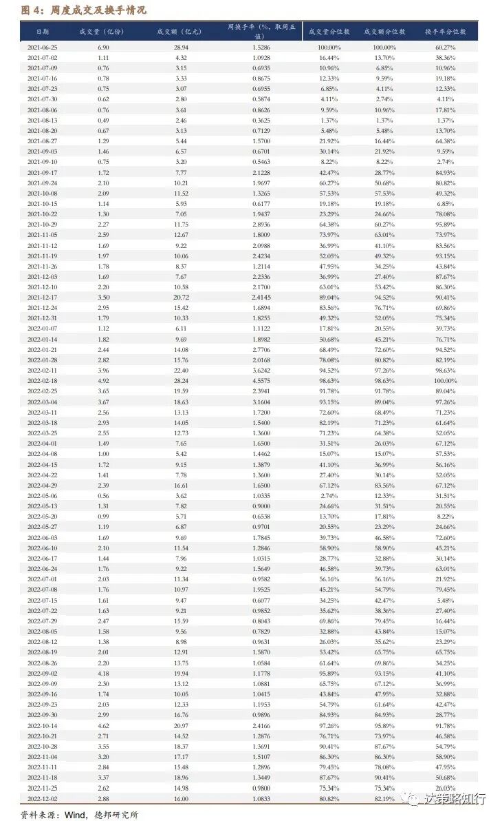 本周REITs成交活跃度下降。本周22只公募REITs平均换手率1.1%,成交金额平均值3.2亿元,成交量0.58亿份;上周平均换手率1.12%,成交金额平均值3亿元,成交量0.52亿份。22只公募REITs周度成交金额为16亿元,成交量为2.88亿份,较此前一周环比变化(6.82%)和(9.73%),对应上市以来历史分位水平分别为82.19%、80.82%;周度换手率为1.08%,对应上市以来历史分位水平为35.62%。