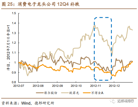 智能手机渗透率迅速提升使得消费电子在12年前三季度同样表现抗跌,但受成长风格Q4业绩不及预期拖累,行业第四季度补跌。随着苹果接连推出iphone4、4S、5,2011-2013年我国智能手机产品渗透率迅速提升,产业高景气使得消费电子产业链、特别是果链上市公司在2012年盈利表现亮眼,例如歌尔股份12年单季度归母净利润同比增速均超过50%,欧菲光盈利翻倍增长,在消费电子的支撑下,12年前三季度电子行业指数相对抗跌。然而,由于12Q3创业板归母净利润增速回落至-14.4%,低于此前预期,叠加12Q4创业板迎来解禁高峰,成长风格下跌,受此影响,电子行业在12Q4补跌。