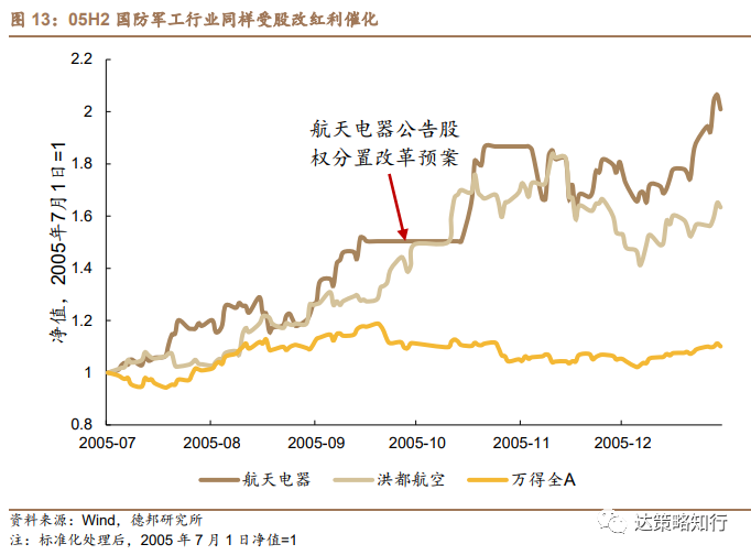 此外,国防军工行业同样受股改红利驱动,同时行业的资产证券化预期强烈。一方面,改革历来是推动军工板块基本面向好的重要因素,另一方面,早在2004年,国防科工委和国家发改委就联合发布了《国防科技工业产业政策纲要》,针对国防工业企业改制,提出要 “推进国防科技工业投资主体多元化,鼓励社会资金参与国防科技工业建设,鼓励符合条件的军民两用产品生产企业改制上市”,叠加大部分军工资产都在上市公司以外,因此行业本身存在资产证券化预期,而股改过程中,航空航天类上市公司的股改方案再次充分体现了国防资产证券化的思想,进一步催化行业的资产证券化预期。05年9月28日,航天电器公布了股权分置改革预案,05H2航天电器股价实现翻倍。