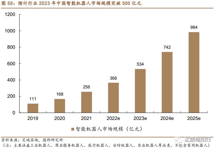 政策层面积极支持,“十四五”规划机器人行业年均营收增速超20%,预计行业2023年规模突破500亿元,作为机器人行业的重要分支,工业机器人行业在政策大力扶持叠加产业内生增长驱动强劲的背景下有望迎来快速发展。机器人产业的发展受到我国政府的高度重视,已成为国家政策重点支持领域。2021年12月,工业和信息化部等15部门联合印发了《“十四五”机器人产业发展规划》,规划提出,到2025年,我国成为全球机器人技术创新策源地、高端制造集聚地和集成应用新高地。一批机器人核心技术和高端产品取得突破,整机综合指标达到国际先进水平,关键零部件性能和可靠性达到国际同类产品水平。机器人产业营业收入年均增速超过20%。到2035年,我国机器人产业综合实力达到国际领先水平,机器人成为经济发展、人民生活、社会治理的重要组成。另外,在增加高端产品供给方面,规划提出面向制造业、采矿业、建筑业、农业等行业,以及家庭服务、公共服务、医疗健康、养老助残、特殊环境作业等领域需求,集聚优势资源,重点推进工业机器人、服务机器人、特种机器人重点产品的研制及应用,拓展机器人产品系列,提升性能、质量和安全性,推动产品高端化智能化发展。根据艾瑞咨询预测,2023年我国智能机器人市场规模(主要涵盖工业机器人、商业服务机器人、医疗机器人、安防机器人、农业机器人等品类)有望达534亿元,至2025年市场规模接近千亿。