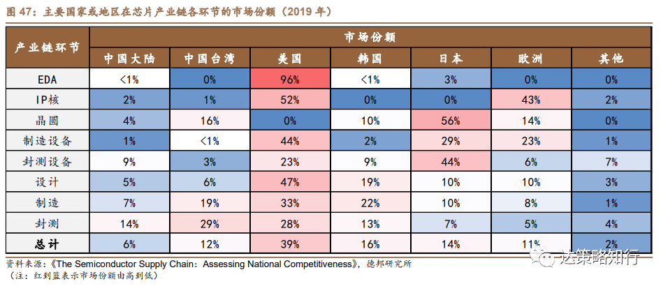相比美国,当前我国的半导体产业链整体实力仍相对落后,根据《The Semiconductor Supply Chain:Assessing National Competitiveness》中的统计,中国大陆在全球芯片产业链的整体市场份额较为落后,具体来看,中国大陆在封测及封测设备方面已经具备较强国际竞争力,但在EDA、IP核、部分半导体材料、部分半导体设备领域都存在明显的“卡脖子”问题,而这些领域也正是美国及其盟国的优势领域,我国亟待补足。美国芯片法案和对华半导体出口管制措施的出台,将推动半导体国产化加速,利好国产半导体设备及材料。