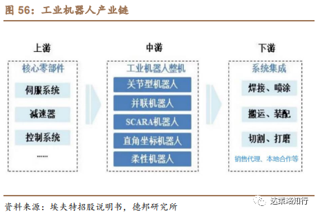 工业机器人产业可分为核心零部件、整机制造和系统集成三大核心环节,中国本土企业亟需重点突破产品主要包括多关节机器人产品、平面多关节机器人产品。工业机器人产业链上游主要为伺服系统、减速器、控制器等核心零部件和齿轮、涡轮、蜗杆等关键材料。减速器、伺服系统(包括伺服电机和伺服驱动)及控制器是工业机器人的三大核心零部件,直接决定工业机器人的性能、可靠性和负荷能力,对机器人整机起着至关重要的作用。产业链中游是工业机器人整机制造。产业链下游主要面向终端用户及市场应用,包括系统集成、销售代理、本地合作、工业机器人租赁、工业机器人培训等第三方服务。据埃夫特招股说明书,中国本土企业亟需重点突破产品主要包括多关节机器人产品、平面多关节机器人产品。在该等领域,国产机器人分别占 21.50%、11.30%。外资仍然占有绝对市场份额,国内厂商需要在该领域实现重大突破。