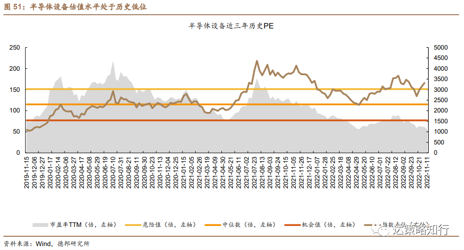 全球半导体行业景气度下滑,而中国大陆半导体行业逆周期扩产,国内半导体设备公司在手订单充足,23年业绩增长确定性强。根据IC Insights的最新预测, 2022Q3至2023Q1的时间段将标志着IC市场面临有记录以来的第七次连续三个季度下跌,其中,2023Q1,IC市场销售规模将下滑3%,预计2023年全年整个IC市场销售规模将下滑6%,全球半导体行业整体景气度向下。然而,中国大陆半导体产业在外部不利因素倒逼行业替代、以及政策大力支持的背景下仍逆周期扩产,中芯国际上调资本开支以及半导体设备公司充足的在手订单均是国内半导体行业逆周期扩产的佐证:1)11月10日晚间,中芯国际再度大幅上修资本开支,预计2022年全年资本支出计划从320.5亿元上调为456.0亿元,上修资本开支主要是为了支付长交期设备提前下单的预付款。头部企业加大逆周期投资力度消除了市场对于23年下游扩产放缓的担忧,同时反映设备国产化率提升进程有望加速;2)主要半导体设备公司22Q3在手订单(此处以合同负债替代)金额环比增长8.8%,同比增长(可比口径)44.3%,验证当前在手订单充足,23年业绩增长确定性较强。从估值角度来看,截至11月13日,半导体设备市盈率TTM为54.52x,估值处于近三年最低位。