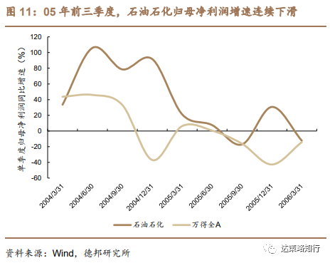 石油石化行业在05H2的超额收益主要来自中国石化,股改预期是其股价的主要催化。中国石化在当时的石油石化行业的市值占比超过80%(以05年7月1日市值计算),因此05H2的石油石化行业指数趋势主要受中国石化股价走势的影响。从盈利能力看,石油石化行业在05年前三季度的归母净利润增速连续下滑,较全部A股未有明显亮点,因此盈利因素并非其超额收益的来源。股改预期是中国石化05H2股价的主要催化:2005年10月,中国石化出售壳公司中国凤凰给长航集团,11月,公司公告拟以76.72亿港元吸收合并镇海炼化,各类股权剥离及整合事件给予市场股权分置改革临近的预期,市场普遍将中国石化视作前一阶段股改“标杆”个股——长江电力的接棒者以及指数的“稳定器”。