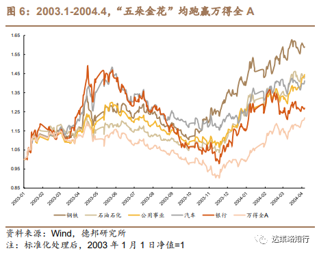 2003年价值投资理念兴起,“五朵金花”(钢铁、汽车、石油石化、能源电力、银行)作为典型的价值发现行业经历了一轮上涨行情,而在05H2的探底阶段,前期热门的“五朵金花”中,仅银行、石油石化行业指数小幅跑赢万得全A指数,前期占优行业在市场探底期并非绝对的“避风港”。