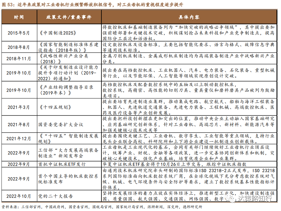 近年政策频繁释放积极信号,对工业母机重视程度逐步提升。2019年之前,政策对于工业母机行业主要为方向性和概念性指引,包括设定数控机床标准,确定为战略产业项目,列入产业结构调整指导目录中的鼓励类行业等,例如《中国制造2025》将高档数控机床列为未来十年制造业重点发展领域之一,同时明确到2025年,高档数控机床与基础制造装备国内市场占有率超过80%;2019年后,政策对工业母机行业的支持政策更为具体,且政策站位不断提升,具体来说,2021年9月,国资委党委扩大会议提出针对工业母机加强关键核心技术公关;12月出台《“十四五”智能制造发展规划》,并将工业母机作为重点领域进行支持,提出研发智能立/卧式五轴加工中心、车铣复合加工中心、高精度数控磨床等工作母机,到2025年,规模以上制造业企业基本普及数字化,重点行业骨干企业初步实现智能转型;今年9月,工信部发布会中表示工业母机行业的顶层设计正在进行中。
