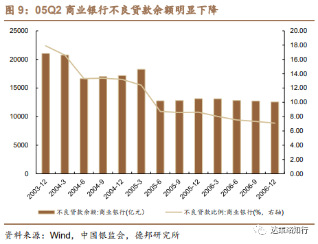 其中,银行业主要系基本面情况好于预期。一方面,05H2银行资产质量明显改善,随着不良资产的集中剥离,商业银行不良贷款率从05Q1的12.4%下降至05Q2的8.71%,另一方面,基于05年初的“紧信贷”宏观调控背景,市场此前降低了对银行业盈利的预期,但随着信贷增速在05年6月逐步回升,上市银行资产规模加速扩张,同时主要公司05Q3的归母净利润同比增速较Q2明显提升,银行实际的盈利表现好于预期。此外,05年6月至年底,外资战投加速入局,例如,建行引入美洲银行与淡马锡作为战略投资伙伴,中行则引入苏格兰皇家银行集团(RBS)等,外资战投入场同样加强了银行内部治理能力提升的预期。