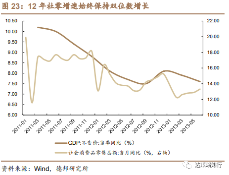 经济走弱背景下,业绩韧性较强的食品饮料在12年前三季度较为抗跌,但11月的“塑化剂”事件冲击使得行业指数快速下行。12Q2和Q3国内GDP同比增速边际下行,市场情绪低迷、整体风险偏好下行,万得全A归母净利润同比负增长,在此背景下,消费基本面相对较好,食品饮料、美容护理、家用电器行业业绩保持中高双位数增长,因此,较强的基本面支撑使得包括食品饮料在内的部分消费行业在12年前三季度表现更为抗跌。然而,12年11月19日,酒鬼酒被报道检测出塑化剂超标,随后该个别事件迅速发酵至全行业,受此影响,食品饮料指数快速大幅下跌。