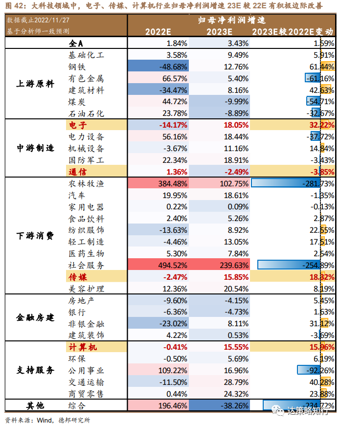 当然,跌幅较大的行业并非100%涨幅越高,根据我们对四个探底期行业表现的分析,我们认为寻底期跑赢行业的核心是寻找预期边际向好,“政策受益&行业景气”整体更安全,大科技契合当前探底期的配置条件。从政策面来看,大科技领域正是政策受益的核心方向,党的二十大报告将科技创新的战略意义提升到了新的高度,强调坚持科技是第一生产力。此外,以预期的行业盈利增速情况作为辅助参考,大科技领域多数行业2023年盈利增速预测较22年有积极边际改善。