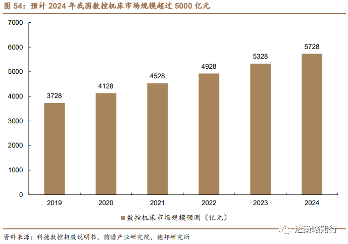 预计2024年数控机床市场规模超过5000亿元,工业母机产业链(特别是高端数控机床领域)值得关注。根据前瞻产业研究院《中国数控机床行业市场需求预测与投资战略规划分析报告》预测,我国数控机床市场规模未来将稳定较快增长,到2024年将达到5728亿元,2022-2024年复合增长率约为7.8%。其中,高端数控机床领域国产替代空间广阔,以五轴联动加工技术为代表的高端数控技术装备的推广及普及是行业大势所趋,一方面,工业上需要加工复杂的曲面,舰艇、飞机、火箭、卫星、飞船中许多关键零件的材料、结构、加工工艺都有一定的特殊性和加工难度,用传统加工方法无法达到要求,必须采用五轴联动、高速、高精度的数控机床才能满足加工要求,另一方面,随着汽车轻量化趋势,传统由多个零件组成的部件向单一零件整合,零件加工特征由平面转向空间,目前国际上主要的汽车零部件加工装备供应商包括格劳博、马扎克、德玛吉等大量采用五轴机床组建生产线。