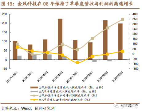 电力设备方面,盈利下行期风电产业的高成长性带来溢价。2005年,我国风电产业正式进入大规模应用阶段,2007年9月,国家发改委发布《可再生能源中长期发展规划》,提出“到 2010年,全国风电总装机容量达到500万千瓦;建成1-2个10万千瓦级海上风电试点项目”,政策扶持之下,2006-2009年,我国每年新增风电装机容量同比增速均接近或超过100%,06-10年也被称为风电行业的“黄金五年”。以风机领域龙头上市公司金风科技为例,公司在08年全A盈利下行期仍然保持了单季度营收与利润的高速增长,而高成长在盈利下行阶段也更显稀缺。市场为稀缺的高成长买单,金风科技在08Q4-09Q1寻底阶段(统计20081001-20090331)股价涨幅达94%,而其他风电类上市公司也普遍有较高涨幅。