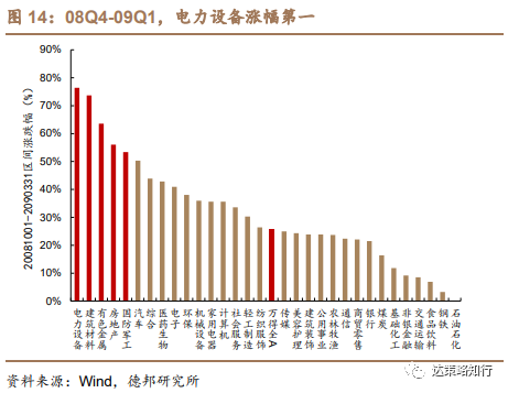 困境反转行业与新兴成长产业超额收益领跑。08Q4-09Q1涨幅前五的行业(统计区间为20081001-20090331)为电力设备、建筑材料、有色金属、房地产、国防军工。其中,困境反转的房地产和高成长的电力设备行业在寻底阶段始终相对万得全A具备超额收益,而有色金属、国防军工相对全部A股的超额收益到08年年底才较为明显。