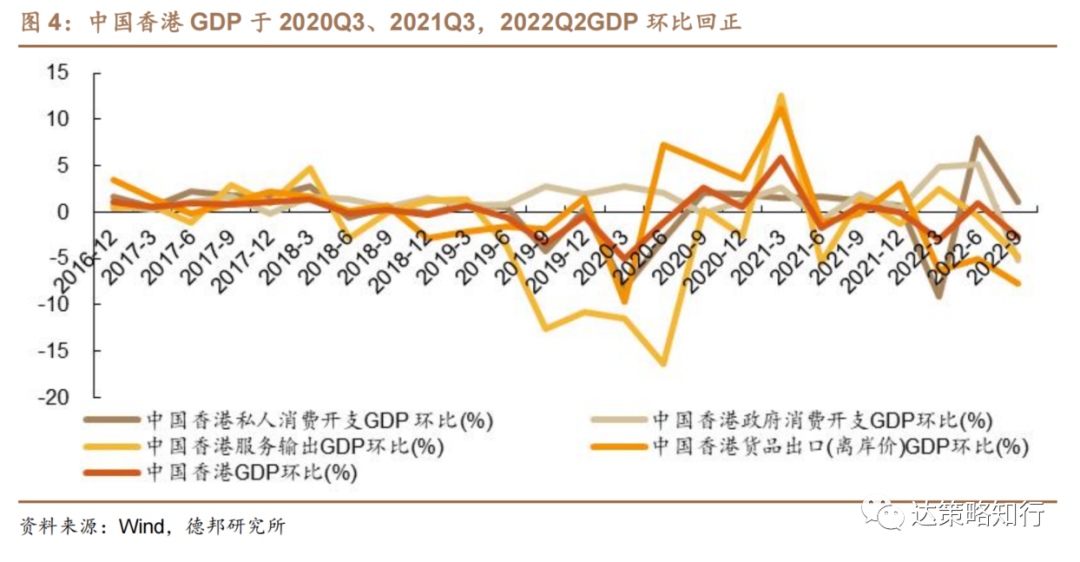 从GDP构成来看,政府消费开支维持稳定,且在疫情初期及奥密克戎疫情期间维持增长。服务输出疫情初期延续下行趋势,2021年Q3大幅回正后继续下行。私人消费开支和货品出口与GDP基本同步变化,货品出口于2020年Q2领先完成大幅修复,私人消费开支2022年Q2修复力度较大。