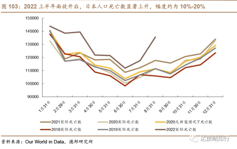 在2022年宣布彻底放开后,日本人口死亡数显著上升,幅度约为10%-20%;这部分超额死亡一定程度量化了在老龄化社会下新冠疫情流行的影响。