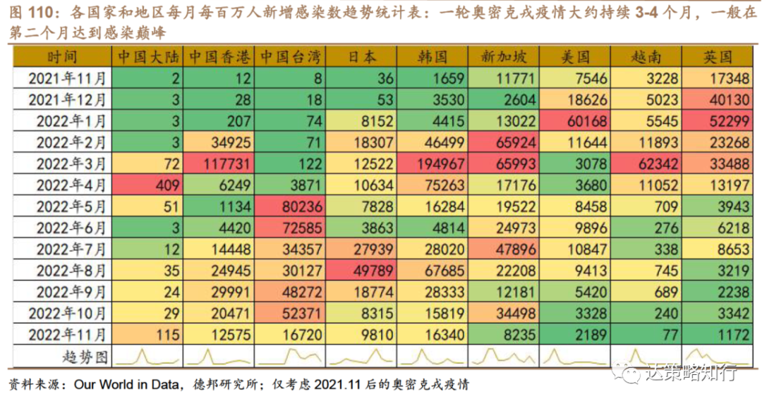 从奥密克戎疫情爆发的规律上而言,通常一轮奥密克戎疫情大约持续3-4个月,且一般在第二个月达到感染巅峰;相应地,超额死亡在第1-2个月达到峰值,3-4个月后回归爆发前水平;这与我们本节所梳理的奥密克戎引致的线下场所人流变化规律一致(在一轮奥密克戎疫情中,由于超额死亡率上升带来的人群自发居家,线下场所人流大约在45-60天触底)。