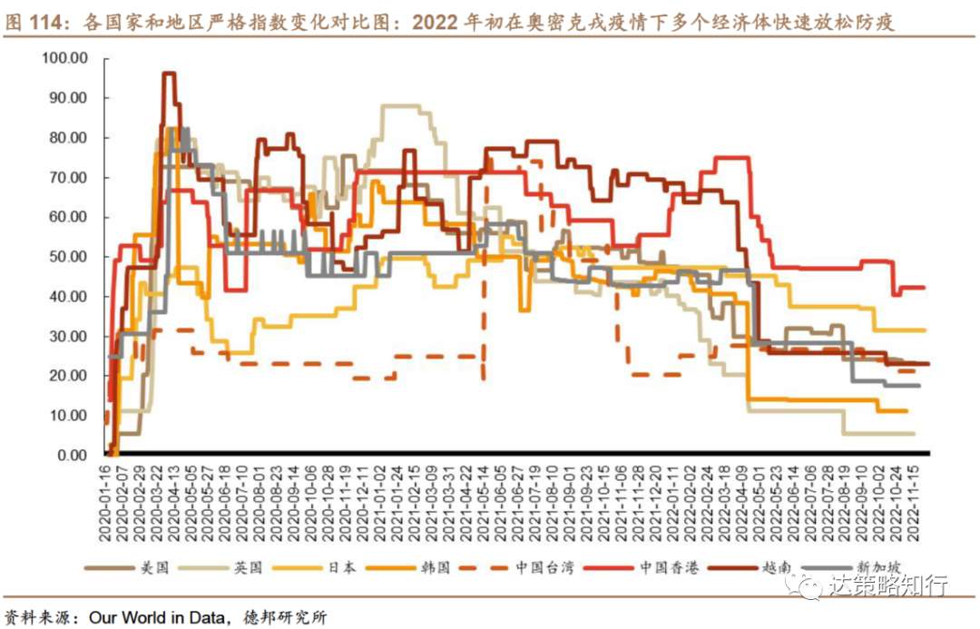 根据牛津大学发布的疫情严格指数(100代表最严格),美国的疫情防控措施经历了随确诊病例上升而收紧、不管疫情确诊是否上升都逐渐宽松两阶段:1)2021年6月前,美国的严格指数与当日新增确诊病例数量正相关性较强;2)2021年6月后,美国疫情防控开始进入逐渐宽松通道,截至2022.11.22日已下降至23.20。