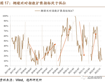 截至12/9,主要工业城市加权拥堵延时指数反弹,报1.679,上个周五为1.575。另外,拥堵延时指数扩散指标(7日平滑)下行处于低位,报14.82%,上周五为14.56%。