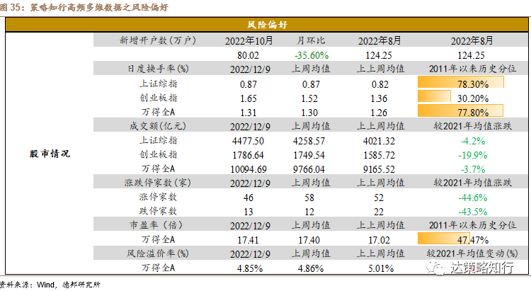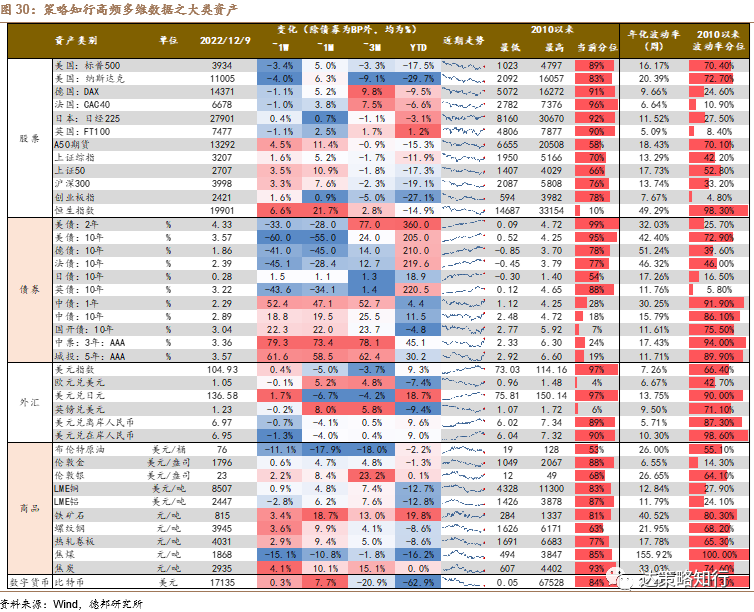 国内:大会定调明年政策,11月外需继续恶化,滞后指标延续弱势。1)12月6日,政治局会议召开,基调上要“更好统筹疫情防控和经济社会发展”,“实现质的有效提升和量的合理增长”。首先是优化疫情防控措施,12月7日新10条发布,在11月11日发布的二十条的基础上继续优化,迈小步,不停步;其次是政策基调上,积极的财政政策要加力提效,稳健的货币政策要精准有力,表述明显更加积极。2)11月进口、出口均大幅度下行,2022年3月以后贸易顺差首度低于去年同期。11月出口同比-8.7%,其中美国、欧盟为-4.29%、-1.64%;分产品来看,机电产品、高新技术产品走弱。进口数量方面,原油和煤及褐煤等商品同比增速均有回落。3)通胀方面,11月CPI回落、PPI持平,PPI-CPI剪刀差负值走小。CPI食品项同比由7.0%下降至3.7%,非食品项、核心CPI均与前值继续持平。PPI生活资料回落,生产资料有所企稳。