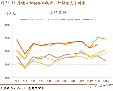 分国别来看,主要国家进口均回落,目前仅俄罗斯、东盟的当月进口同比增速为正。美国、俄罗斯、欧盟、日本、韩国、东盟进口额增速11月累计同比为-0.50、47.50、-7.30、-9.60、-4.40、4.60(%),较前值下降0.8、2.4、1、1.6、2.6、1个百分点。