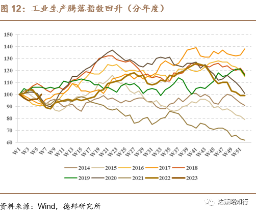 截止2023/2/5,工业生产腾落指数为113,前值109。从分项上看,山东地炼、甲醇、华北焦化、唐山高炉、轮胎出现回升,仅PTA出现回落。(水泥数据滞后,当期记为0)