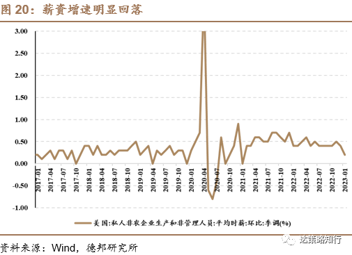 薪资增速明显回落。另外,2023年1月美国私人非农企业生产和非管理员工的平均时薪环比增速为0.2%,前值0.4%,是2021年2月以来的最低值。2017-2019年月平均薪资增速为0.25%。
