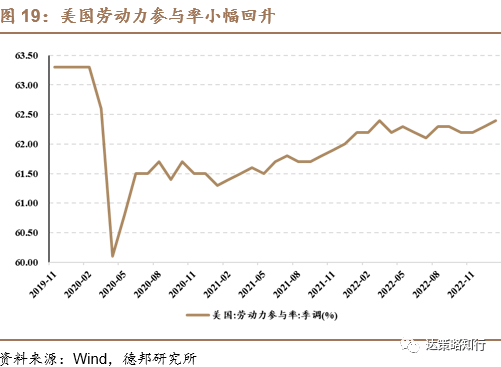 就业市场供给小幅回升,但仍然不强。供给方面,2023年1月劳动力参与率为62.40%,前值62.3%,小幅回升,但仍然明显低于2019年末的63.3%,显示美国人参与劳动的意愿整体仍然不强。