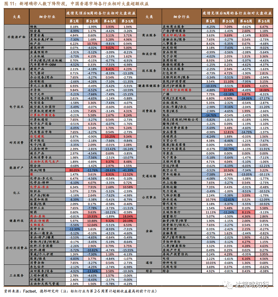 中国香港:包括药品和医疗服务在内的医药、以煤和石油为代表的能源、计算机设备、以及以广告/印刷为代表的商业服务表现相对较好。新增确诊人数(MA7)从见顶到回落至较低位置大约历时5周,其中,第2-5周累计超额收益最高的10个行业分别为:药品-仿制药、对卫生行业的服务、药品-其他、煤、化学品-农业、住宅建筑、商业印刷/表格、石油和天然气生产、计算机外围设备、生物技术。
