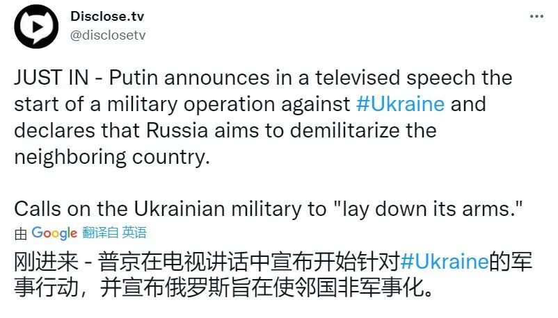 24日清晨,普京发表了一个电视讲话,宣布正式开始对乌克兰的军事行动。普京电视讲话的同时,基辅传来连续剧烈爆炸,俄军行动已经开始。