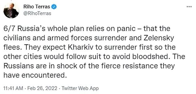 北约成员国爱沙尼亚的前国防部长芮豪·特拉斯(Riho Terras)在推特上发了一条长长的帖子说,俄罗斯总统普京认为整场战争会很容易,一切都会在一至四天内完成。