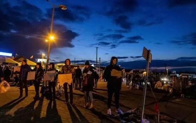 志愿者举牌子帮助乌克兰难民进入波兰的交通和食宿
