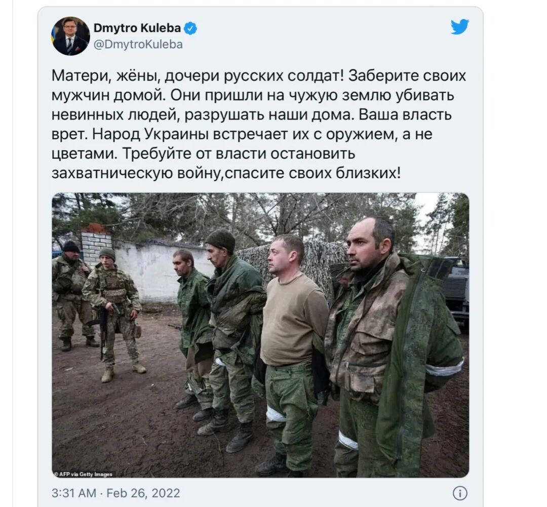 “俄罗斯士兵的母亲、妻子、女儿们!把你们的人带回家。”库莱巴在推文译文中写道。
