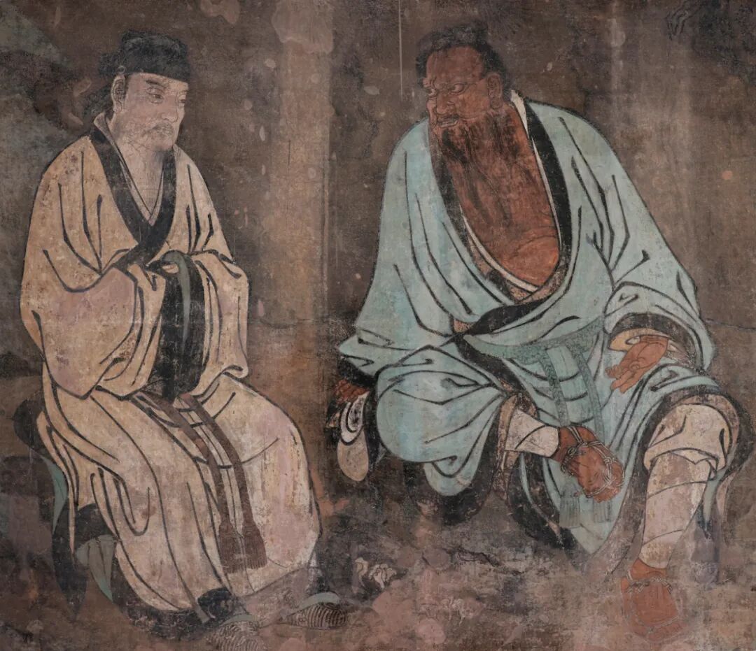 钟吕论道图位于永乐宫纯阳殿后壁,描述的是吕洞宾于暮春游沣水之上,遇钟离权而被度化入道时的情景。画中吕洞宾着白袍双手笼于袖中,双脚微微张开,端坐于磐石之上,身体略前倾,呈倾听的姿态,神色极为恭谨。旁侧钟离权双目圆睁,头顶双髻,姿势显得较为放松,着石绿色衣袍,腰间用麻绳随意扎起,敞胸露腹,右膝自然弯曲于石头上,脚穿草鞋,右手支撑身体,左手放于左腿上,小指与无名指弯曲,食指与中指并拢,这种放松的姿态和手势是度化吕洞宾悟道成真的表达。总观整幅壁画,构图气韵生动,情景交融,人物刻画细致入微,堪称传统壁画的精绝之作。