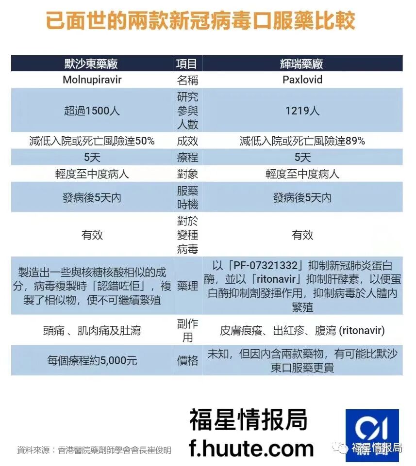 美国默克药厂(Merck)上月公布数据,指其研发的新冠病毒口服药物(Molnupiravir)能够有效将确诊者入院或死亡风险减低50%,成为全球首只证实有效治疗新冠肺炎的口服药。美国辉瑞药厂(Pfizer)昨天(5日)亦公布,其研发的口服药(Paxlovid)治疗效果更理想,能大幅减低患者住院或死亡率达到89%。两款药物的对象都是轻度至中度的新冠肺炎病人,疗程为5天,对于变种病毒亦有效。成效方面,辉瑞药厂在数据上更胜一筹,但定价则未知会否较高。下文将会比较两款药物的异同。