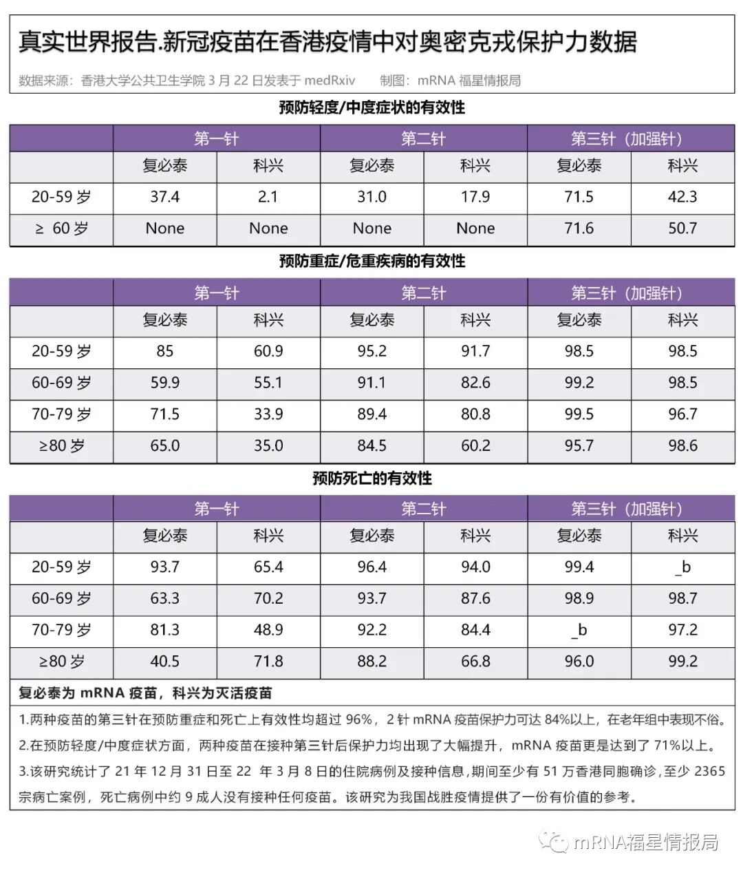3月22日,香港大学公共卫生学院发表了一份新冠疫苗在真实世界的研究数据,打完第三剂科兴或复必泰疫苗后,预防重症率和死亡率有效性均超过了97%。这份研究报告为我国战胜新冠病毒提供了一份极有价值的参考。