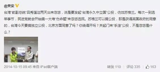 “苏格兰公tou要英国政府同意,你台湾公tou,经过北京方面同意了吗?这么干,简直就是关起门来‘手淫公tou”……”