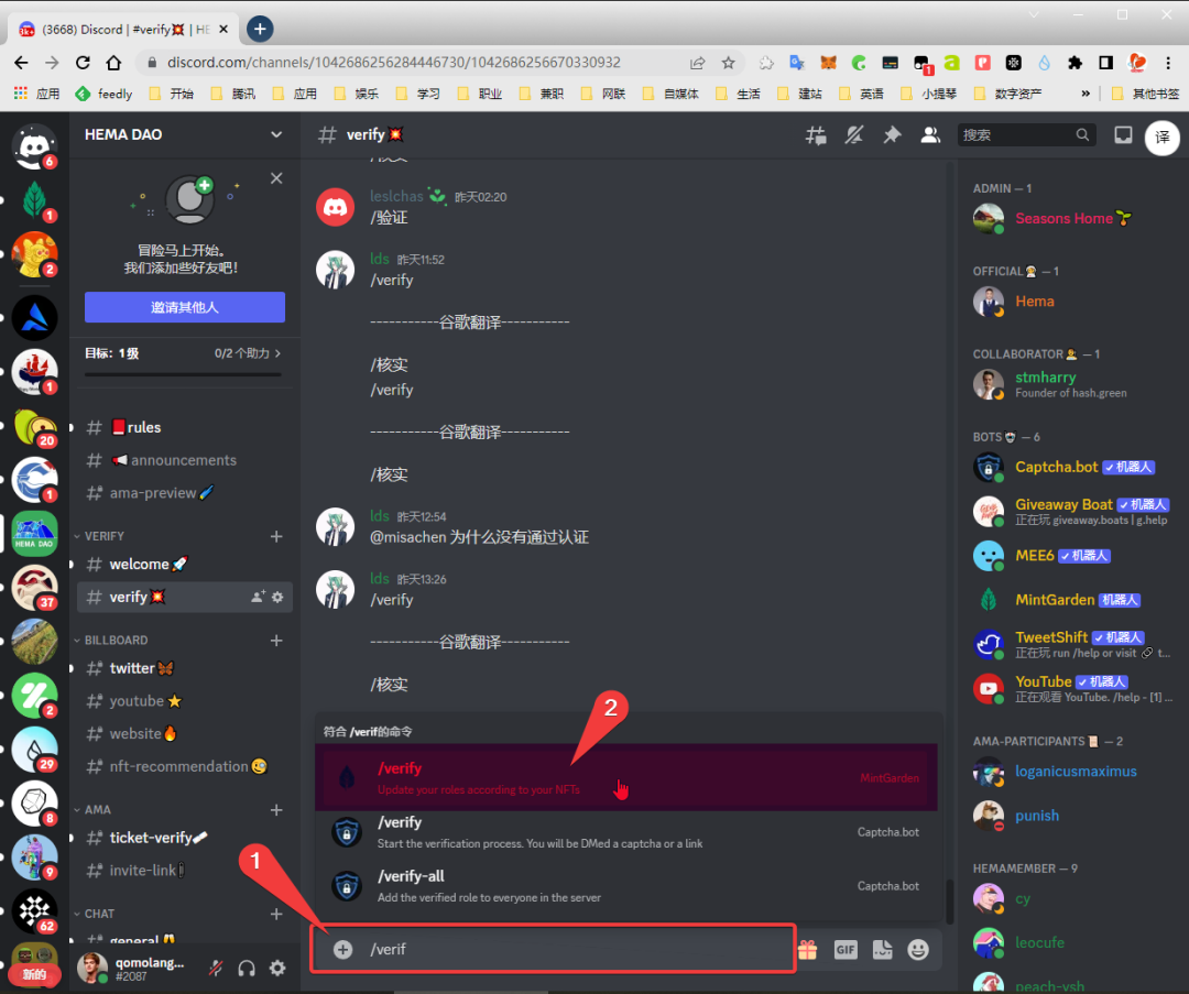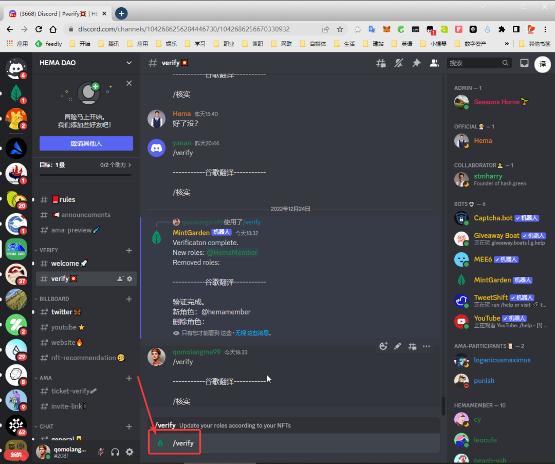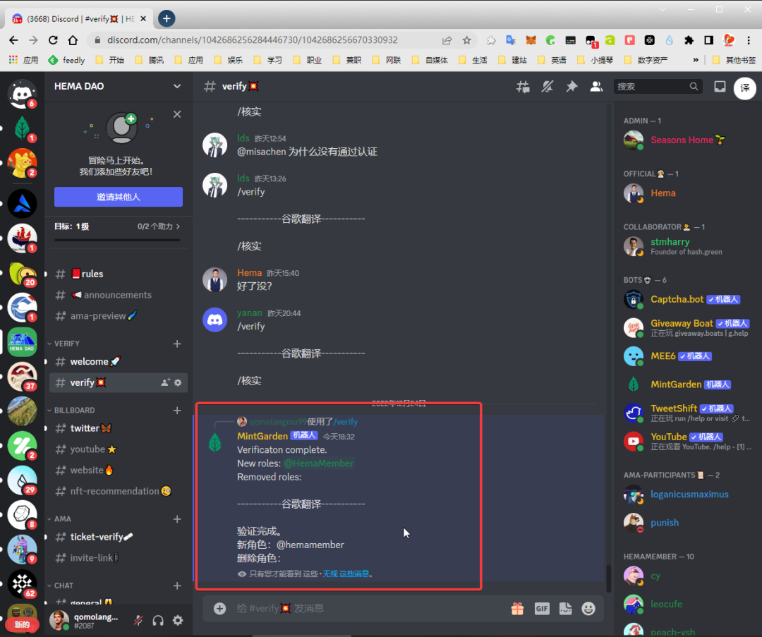 10.3 在“#verify”验证频道发送/verify命令,完成DC验证