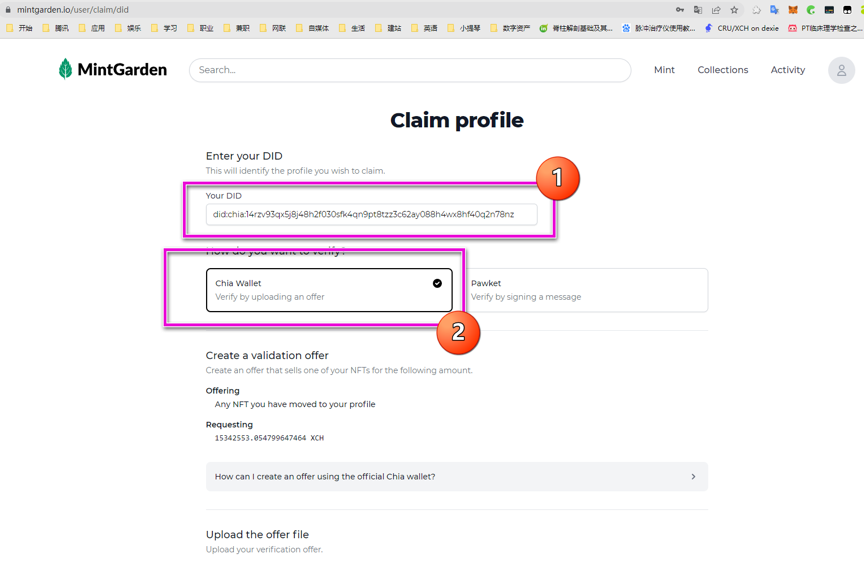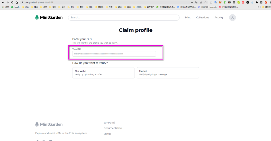 4、将钱包里的DID复制到Mintgarden的“Your DID”