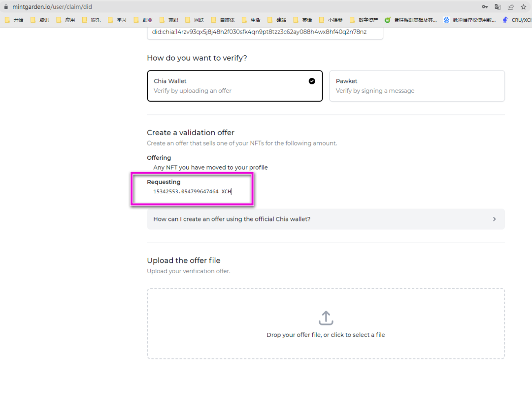 6.2将Mintgarden网站往下滑动,查看“Requesting”。下面的数字是区chia官方钱包创建报价文件时的价格。图中为“15342553.054799647464 XCH”