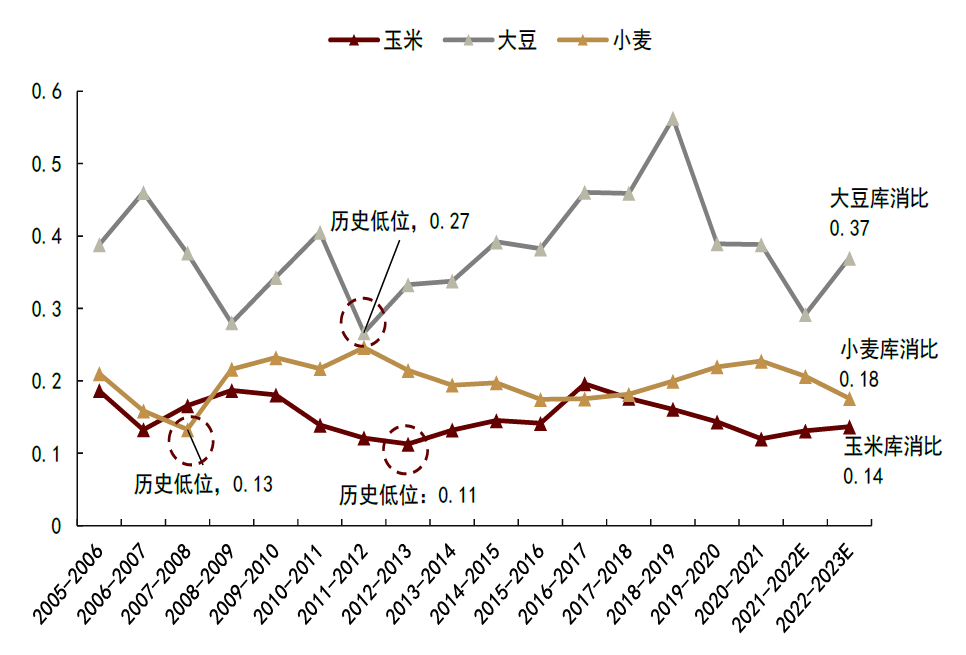 库存修复,难言乐观:2021/22年度全球玉米、大豆、小麦、棉花等主要农作物库存均降至五年历史低位,叠加俄乌地缘冲突,全球粮食供给担忧得到进一步强化。随着2022/23年度的开启,我们看到库存恢复情况仍难言乐观,从预测数据看,地缘冲突导致乌克兰冬小麦、春玉米产量受到不可逆减产,尽管美国、加拿大、巴西、印度等主产国贡献边际增量,但全球农产品供给紧平衡趋势未变。我们看到,除大豆产量因美国、南美增产而有所修复以外,其余主要农产品库存大概率将继续去化。2022/23年度全球小麦、玉米、棉花、大豆的库存消费比的同比变化为:-1.46%,-0.05%,0.01%,2.9%。