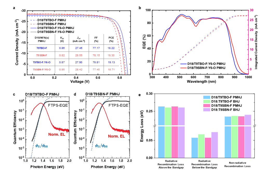 近日,香港城市大学的任广禹教授团队基于课题组前期在逐层沉积器件制备技术与材料性能关系上的新发现(Nat. Commun. 2021, 12, 468),通过选择强聚集性质的给体聚合物D18配合Y6系列小分子受体,理论计算模拟分子间的相互作用行为,精确薄膜性质调控实现了超过19%的光电转换效率并在美国Newport光伏实验室进行了认证,同时与南京大学张春峰教授团队合作,通过超快光谱表征技术,分析了逐层沉积形成的平面混合异质结(PMHJ)与传统BHJ结构里面的激子和载流子动力学行为。该工作为理解高效PMHJ结构的有机太阳能电池工作机制提供了强有力支撑。本论文通讯作者是港城市大学任广禹、Francis (Ray) Lin、南京大学的张春峰;第一作者是蒋奎(港城市大学)、张杰(中国科学院深圳先进技术研究院)、钟成(武汉大学)。