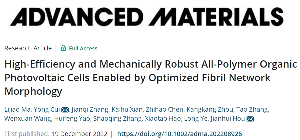 Ma, L., Cui, Y., Zhang, J., Xian, K., Chen, Z., Zhou, K., Zhang, T., Wang, W., Yao, H., Zhang, S., Hao, X., Ye, L. and Hou, J. (2022), High-Efficiency and Mechanically Robust All-Polymer Organic Photovoltaic Cells Enabled by Optimized Fibril Network Morphology. Adv. Mater.. Accepted Author Manuscript 2208926.