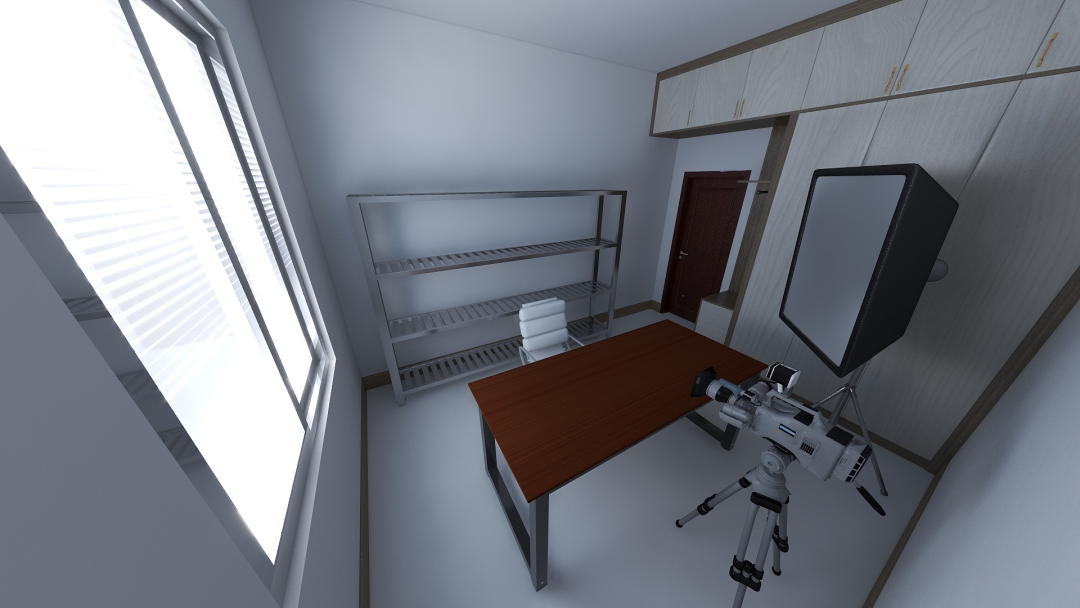 初步规划是拿出家里的一个小房间,大概14平米,用自己喜欢的皮衣靴子等等作为拍摄背景,我自己坐在背景墙面前,用一盏灯打出伦勃朗光,由此就有了一个很简单的A Roll拍摄环境。我用酷家乐做了个简单的设计图👇,比较直观。