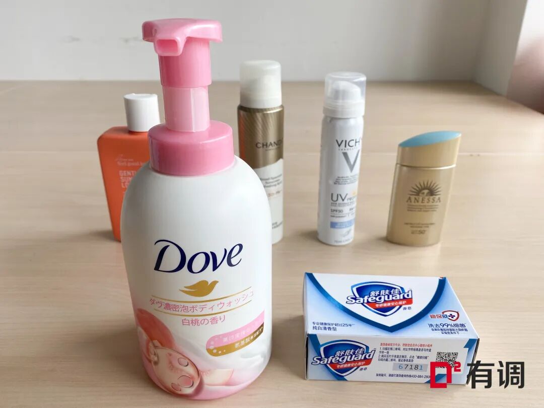 防晒霜都能被香皂清洗掉(只留少量残留,评测员由于多次做实验,手皮肤缝隙里有残留),我们这次买的沐浴泡沫清洁力不是特别强,但其实用清洁力好一些的沐浴乳再搭配浴巾,也能洗掉。
