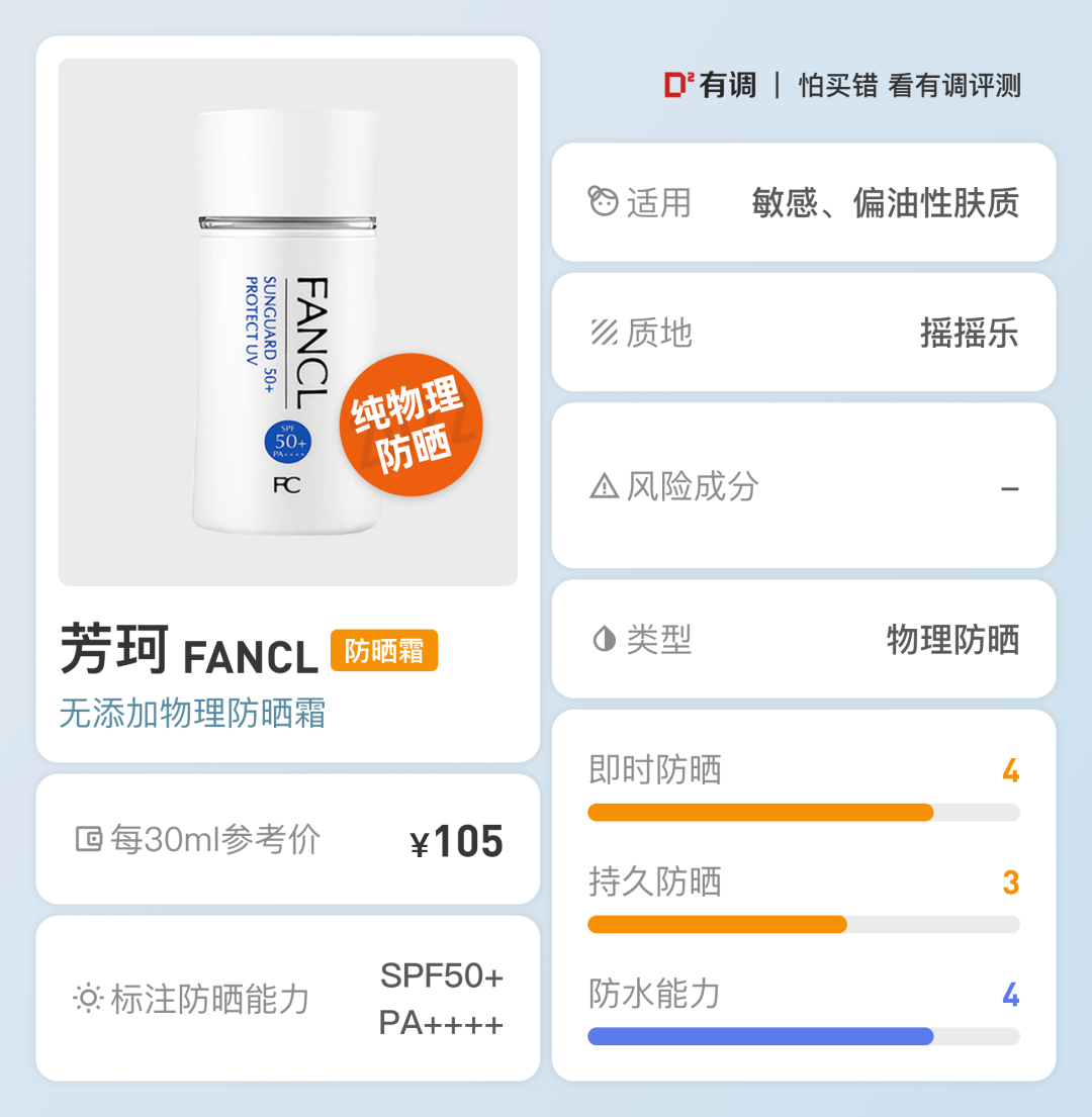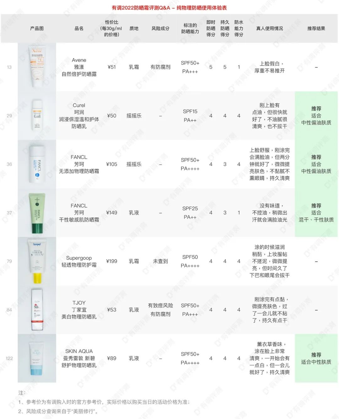 应大家的呼声,我们把即时防晒4分及以上、持久防晒3分及以上的纯物理防晒霜,由3个评测员使用了一周,使用结果如下,供大家参考: